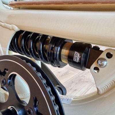 Le Fat Street Xtrail cargo est équipé d'une suspension arrière DNM réglable sur 6 positions, vous permettant d'ajuster la hauteur de selle sur une plage de 100 mm, entre 85 cm et 95 cm. C'est le premier vélo cargo biplace doté d'une suspension réglable, offrant ainsi un confort optimal adapté à chaque utilisateur.