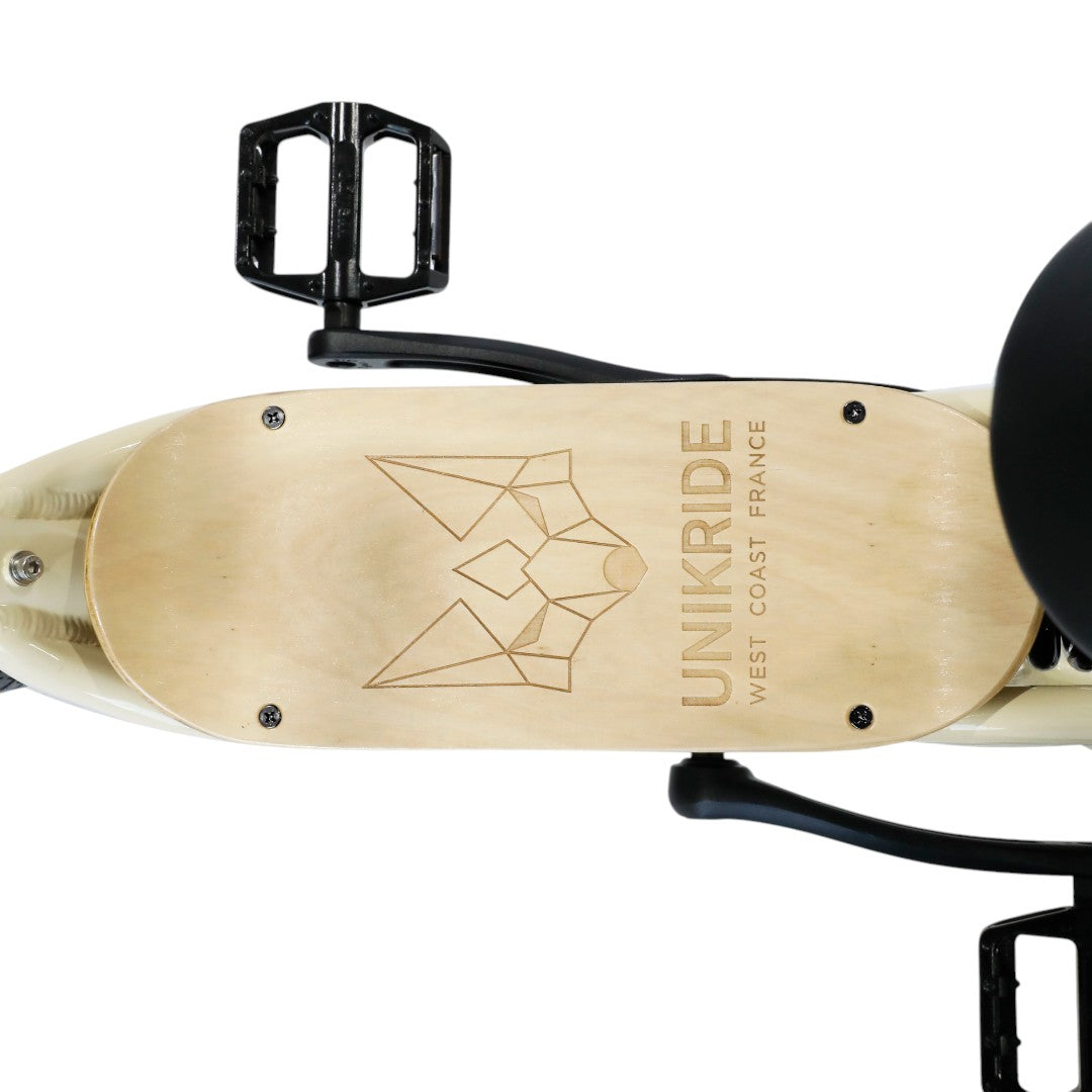 Support de pieds en bambou gravé UNIKRIDE pour une finition soignée. Vous pourrez rouler à 2 adultes et 1 enfant ou 1 adulte et 2 enfants.